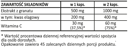 Składniki: ekstrakt z granatu (77%), hydroksypropylometyloceluloza, witamina C, skrobia, substancja przeciwzbrylająca: sole magnezowe kwasów tłuszczowych.