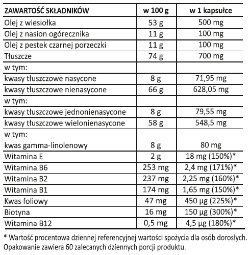 Składniki: olej z wiesiołka, otoczka kapsułki: żelatyna spożywcza wołowa, olej z nasion ogórecznika, olej z pestek czarnej porzeczki, substancja utrzymująca wilgotność: glicerol, witamina E, olej słonecznikowy, substancja przeciwzbrylająca: ditlenek krzemu, witamina B6 , barwnik: tlenek żelaza, witamina B2, witamina B1, kwas foliowy, biotyna, witamina B12.